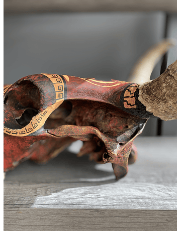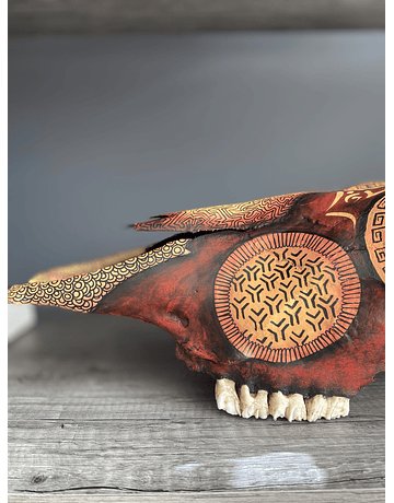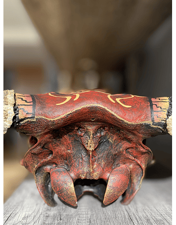 CABEZA DE TORO DE RESINA INTERVENIDA POR ARTESANOS HUICHOL.