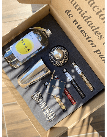 Ginebra Diega + 4 tubos con especies artesanales + Jigger japonés y Shaker Deluxe Intervenidos Wixárika
